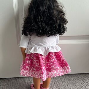 This delightful doll is dressed in a charming pink floral dress paired with a cozy white cardigan and matching pink shoes. Accompanied by a fluffy plush dog. Set includes veterinarian scrubs & stethoscope for imaginative play. Set also includes multiple outfits, pajamas, and 2 sleeping bags.