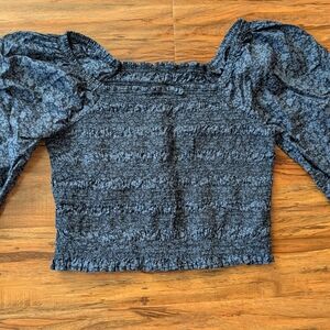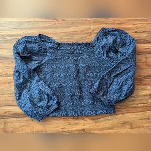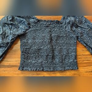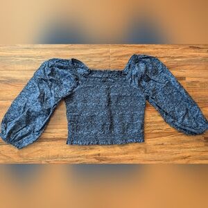 This stylish blouse features a smocked, fitted design with voluminous puff sleeves, offering a chic and comfortable fit. The blue color adds a touch of elegance, making it perfect for both casual and formal occasions. The soft, elasticized fabric ensures a flattering silhouette. 100% Cotton. Great condition.