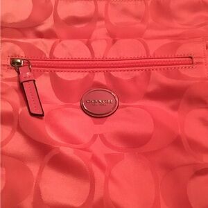 This Coach crossbody bag in a striking pink hue combines style and functionality. Its signature pattern and adjustable strap make it a standout accessory for everyday use.