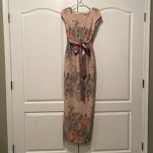A textured finish and pastel florals add glamour to AP's elegant column gown. A satin ribbon belt ties the look together. Hidden zipper closure at the back. High neckline. Cap sleeves. All over floral print with textured finish. Ribbon belt @ waist. Column silhouette. Lined. Slit at back hem. Hits at floor.