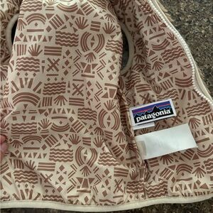 Chic Patagonia jacket featuring gray and white stripes. Mint accents add a fresh touch. Ideal for everyday comfort. Size 6 months