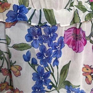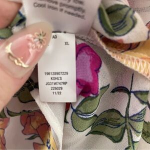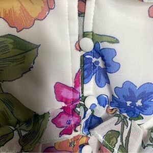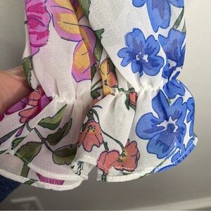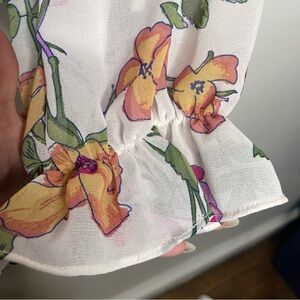 This charming blouse from SO features a flutter sleeve design in a delightful pink, blue and orange color palette.