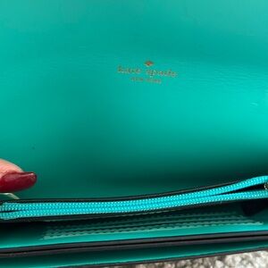 New Kate Spade New York Pim Arbour Hill Smooth Leather Wallet in black with aqua color interior. It has 4 divisions which 2 of them have 4 card holders. The other 2 (1 has a zipper and the other one is open for dollar bills. I have tried to describe it to the best of my knowledge. In addition included are some pictures with more details. If you have any questions please ask me before buying. Thanks