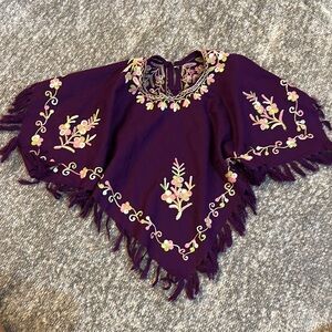NWOT girls Purple floral hand Embroidered Poncho with Fringe size 3/4