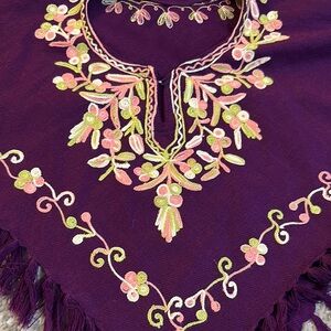 Beautiful purple poncho with floral embroidery and fringe details. Perfect for adding a bohemian touch to your outfit.