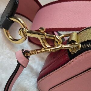 Marc Jacobs Snapshot Crossbody Bag with Guitar Strap. Pink, Red and Gold colorblock.