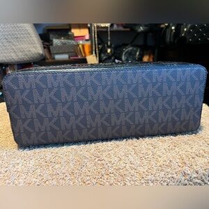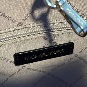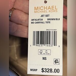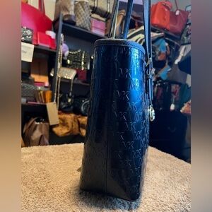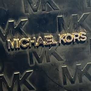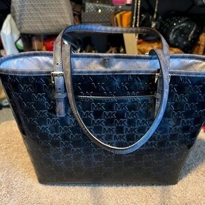 Stylish black tote with MK logo pattern. Features dual handles and signature charm.