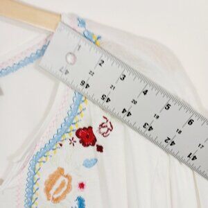 Liv Los Angeles 1X Long Sleeve Creamy White Embroidered Top, Boho, Bohemian. Super soft, and comfy. Light weight. NOTE: See photos for the top of shoulder seams the embroidery does not line up. If something like that bothers you this top won't be for you. Otherwise this top is in very good pre-owned condition. It also has cute detail at end of sleeves with some folded pleating accents.