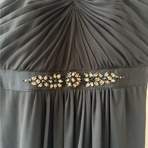 This stunning black gown by Adrianna Papell features a strapless neckline and a fitted bodice with elegant ruching. The full-length skirt flows gracefully, making it perfect for cocktail events. A decorative embellishment at the waist adds a touch of sparkle to this classic dress.