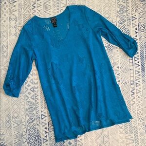 Beautiful turquoise top by Clara Sun Woo. Slightly sheer material for a beachy summer look. Features a v-neck and side slits. Size XS. New condition.