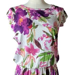 NEW Lascana Flutter Sleeve Flowy Viscose Midi Dress White Purple Pink Floral 8
