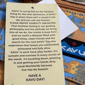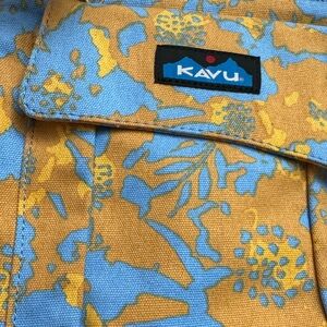 NWT This Kavu crossbody bag showcases a striking blue and orange color scheme, perfect for adding a pop of color. Crafted for durability and style, it features a long adjustable strap with plastic hardware, magnetic snap closure, front zip and patch pocket with key clip, back flat pocket, outer cotton durable canvas, lining polyester. 11”x9”, strap 27” to 50”.