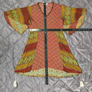 This women's Umgee USA dress features a V-neckline with brown trim and short, wide, split sleeves. It has a red, yellow, and green patterned design throughout. It includes a white rope belt with tassels. Pre-owned. Size SMALL.