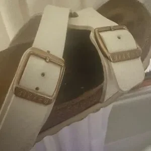 Classic Birkenstock sandals. White straps with adjustable buckles. Comfortable footbed.