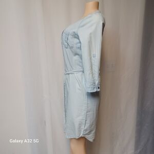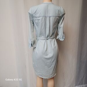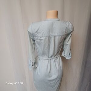 This elegant blue dress from New York & Company features a buttoned front and a tie at the waist, perfect for casual or work settings. The v-neckline and 3/4 cuffed sleeves add a touch of sophistication to its shirt-style silhouette. size SX