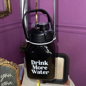 Stay hydrated with this sleek black water bottle featuring a motivational 'Drink More Water' print. Perfect for home dining or on-the-go use. NWOT