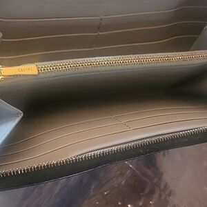 Elegant black leather wallet. Features Celine branding. Sleek and stylish design.