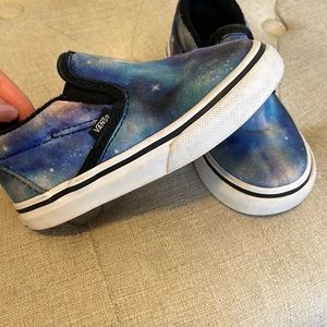 Vans slip-on sneakers with a galaxy design. Features blue and purple hues. Comfortable and stylish for kids. I accidentally bought two in the same size so my daughter never wore these.