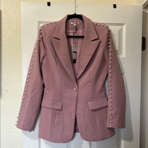 This chic pink blazer features elegant pearl embellishments, perfect for adding a touch of sophistication to any outfit. Ideal for both formal and casual occasions.