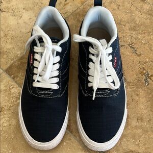 Experience timeless style with Levi's sneakers, featuring a blue canvas upper and crisp white accents. These low-top sneakers boast a classic round toe and a durable white rubber sole, perfect for everyday wear.