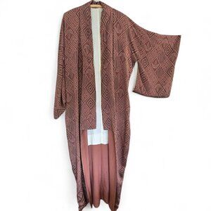 vintage kimono, geometric kimono, open front kimono, lightweight kimono, Japanese kimono, wide sleeve robe, layering kimono, boho kimono, ethnic style kimono, unique pattern kimono, flowy kimono, kimono wrap, brown robe