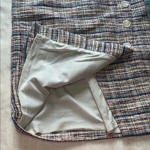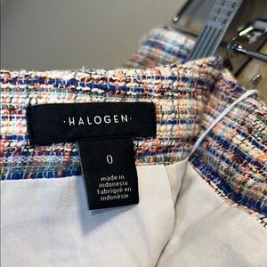 This Halogen skirt showcases a chic pencil silhouette with an asymmetrical cut, ideal for both work and cocktail settings. The midi length and refined white and blue hues provide a sophisticated touch. Its tailored design ensures a sleek and polished appearance. Preowned excellent condition. Measurements see the photos.