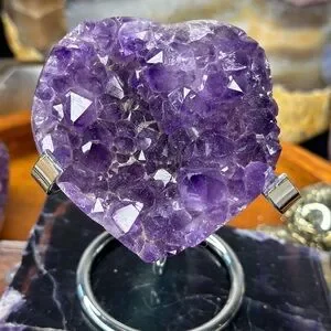 This AAA-quality amethyst heart is a striking crystal carved from deep purple quartz point material, sourced directly from Brazil. Featuring intense color saturation and natural clarity, this high-grade piece is expertly polished into a heart shape, making it perfect for display, gifting, or energy work.