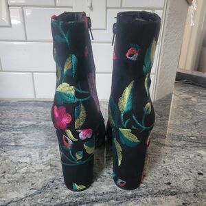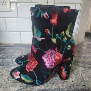 These size 7 booties are perfect for any woman looking for a versatile shoe option. Whether you're dressing up for a night out or running errands around town, these JustFab booties are sure to become a staple in your wardrobe. Add a pop of color to your outfit with these embroidered floral booties. Like new! Worn once.