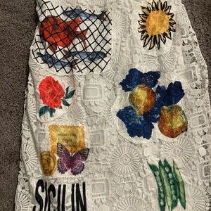 This stunning white dress features a vibrant floral patchwork design, perfect for making a statement. Ideal for any occasion, it combines elegance with a playful touch.