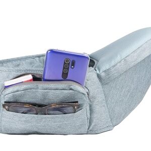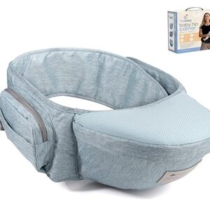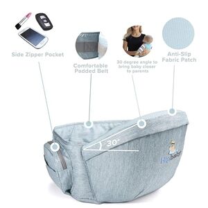 Comfortable and adjustable baby hip carrier. Ideal for parents on the go. Features a supportive seat and storage pockets.