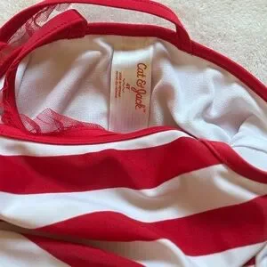 Charming swimsuit with red and white stripes. Features a playful tulle accent. Ideal for beach, pool or picnic fun.