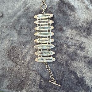 This exquisite bracelet showcases a row of seven elongated Blue Mountain Jasper natural stone beads in a captivating blue hue, complemented by a sleek silver chain. The stones' organic shapes and marbled patterns add a touch of elegance, making it a standout piece in any jewelry collection. 3 different adjustable links.