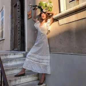 A fresh spin on a ladylike silhouette, our Susanna Dress is sprigged with daisies on cotton-silk organdy fabric. Light and filmy yet structured enough to hold its shape, the design has a crossover v-neck, short tiered flutter sleeves and a high-waisted full skirt with horizontal pleating.