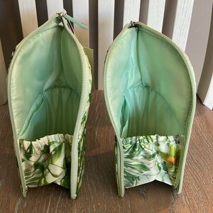 Beautiful botanical designs enhance the joy of organization with this set of zipper pouches. Open interior with a slip pocket. Use for makeup, brushes, accessories etc… Top folds down for easy access and pouch stands up. Approximately 7.5”x4.5”