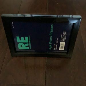Room Essentials set of 3 black frames for 5x7 inch photo. Can be positioned horizontally or vertically, hung on wall or set on tabletop. Gently used, in good condition.
