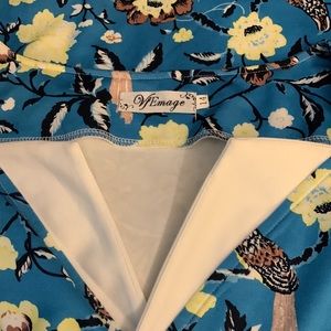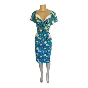 Vintage Style Birds of Paradise Floral Aqua Blue Fitted Pencil Skirt Stretch Dress with faux pockets and side zipper access