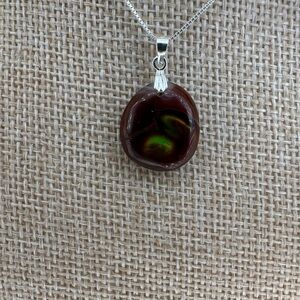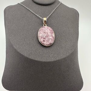 Natural oval sparkling pink tourmaline quartz pendant in a silver 925 setting case and on a silver 925 bail and 18” (45cm) silver copper box chain with lobster clasp closure. The pendant is about 3/4” tall and wide. It has beautiful sparkling pink, violet, and fuchsia tourmaline in quartz.