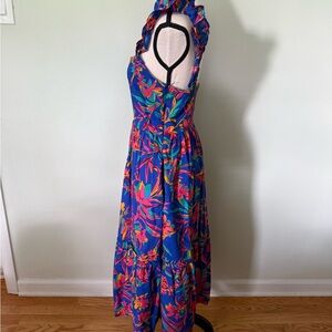 This J. Crew sundress features a smocked design in a vibrant blue and orange color palette, perfect for casual or resort wear. The sleeveless dress boasts a square neckline and flutter sleeves, offering a breezy and feminine look. Its midi length and fitted bodice create a flattering silhouette ideal for sunny days.