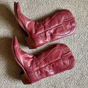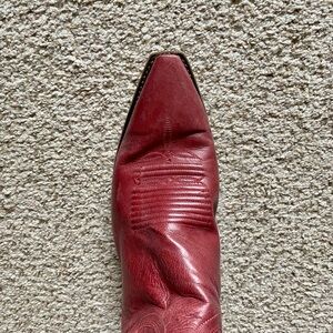 Experience the elegance of Lucchese's red heeled boots, crafted from premium leather with classic Western stitching. These mid-calf boots feature a pointed toe and an angled heel, offering both style and comfort for any occasion.