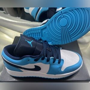 Experience the iconic style of Jordan sneakers with a striking blue and white color scheme. These sneakers feature a classic basketball silhouette, enhanced by a combination of leather and synthetic materials for durability and comfort. The bright blue accents on the laces and Jumpman logo add a touch of flair to this timeless design. They have been tried on once, but new with the box.