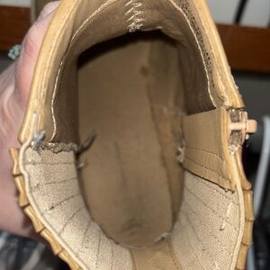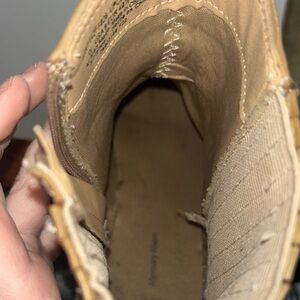 These tan combat and moto boots from Time and Tru offer a stylish blend of ruggedness and sophistication. Featuring a chunky rubber sole and ribbed elastic side panels, they ensure both durability and easy slip-on wear. Perfect for adding a touch of edge to your everyday ensemble.