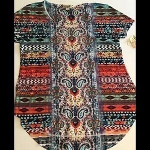 Embrace a bohemian vibe with this floral top. Featuring a vibrant teal and orange design, it's perfect for adding a pop of color to your wardrobe. Preowned but very good condition.