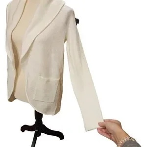 A cozy and elegant ivory cardigan featuring a soft knit design, open front, and practical pockets. Versatile and timeless, it’s perfect for layering and adding a touch of effortless style to any outfit.
