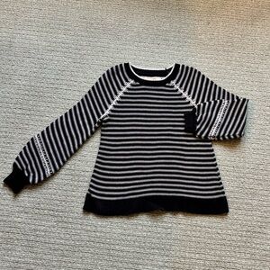 Navy & white LOFT mixed media shell top. V Neck, sleeveless. Size Small Petite. Easy care machine washable, front 100% Rayon, back 100% polyester. Excellent condition.