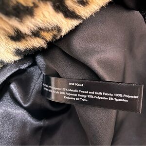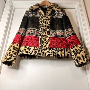 This ultra-luxe piece features rich mixed textures including leopard-print faux fur trim, metallic tweed, and deep red velvet panels with ornate embroidered detailing. Cropped, tailored silhouette with plush faux-fur collar and cuffs for a bold, high-fashion finish. A rare fashion-forward jacket you won’t see everywhere.