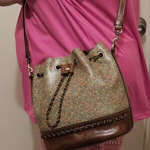 "Coral Bouquet" brown 100% leather bag perfect for any occasion. Features a chain & leather wrapped drawstring. gold tone hardware. snap closure inside. One zipper pocket & two other pockets on inside. adjustable strap so you can use as crossbody or shoulder bag. perfect size back. pictures are deceiving, but I wanted to get all the detail up close.