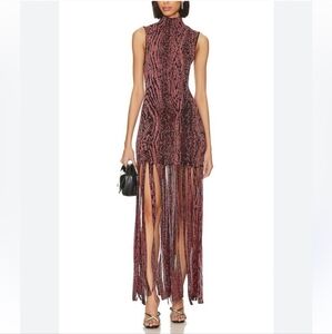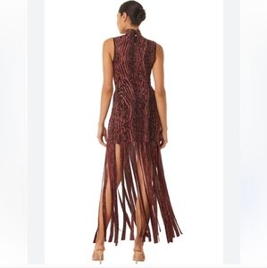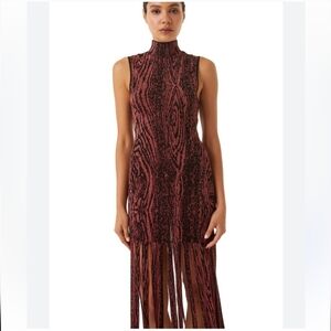 This elegant Josephine sheath dress by Misa Los Angeles is perfect for a cocktail night out, wedding guest, bachelorette party, and any formal occasion. Featuring a striking red and black metallic fabric with a bold woodgrain pattern. The sleeveless design and mock neck add a touch of sophistication, while the Mandarin collar enhances its modern appeal. The bottom has a fun and flirty dramatic fringe hem for added movement and flair. Its sleek silhouette ensures a flattering fit, making it a standout choice for any evening occasion. NWT!! NEVER WORN!!