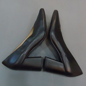 These Naturalizer black heels feature a sleek, pointed toe and a chunky heel, offering a timeless and versatile style. Crafted with a smooth, polished finish, they are perfect for formal or business attire. The interior is lined in a light tan color, adding a touch of elegance to the overall design.
