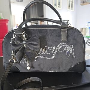 This Juicy Couture shoulder bag showcases a delightful cherry print on a pink and white base, exuding a whimsical charm. The bag's curved shape and trim add a touch of elegance, making it a standout accessory for any occasion.