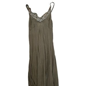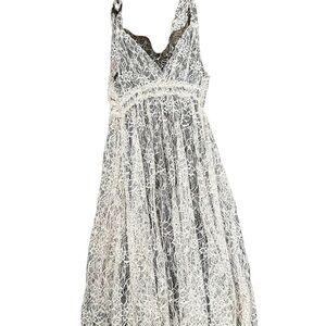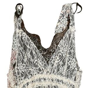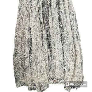 Bridal Twee Boho Lace Two Layer Made in France Lisa D dress. Top layer is cream lace. Bottom brown slip layer.